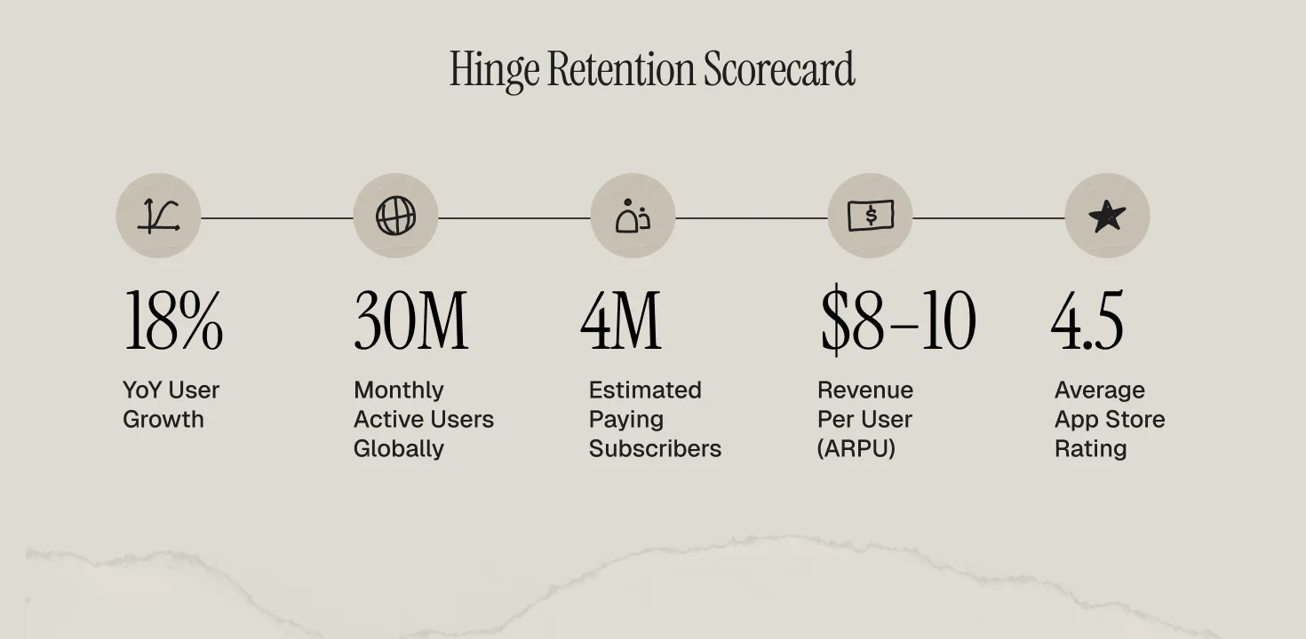 Hinge's "Designed to be deleted" tagline sounds like an anti-retention strategy — and that's precisely why it works. By positioning itself as the dating app focused on genuine relationships rather than infinite swiping, Hinge has built trust that translates directly into higher engagement, longer sessions, and premium conversion rates that outpace competitors. Hinge now reaches approximately 30 million monthly active users globally, with estimated ARPU of $8–10 across its user base and a premium conversion rate significantly above the dating app average.