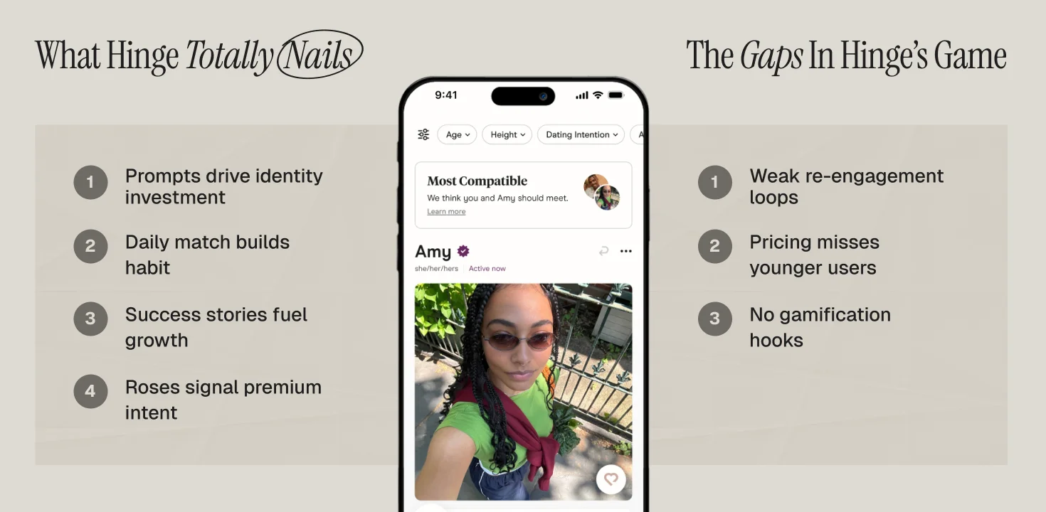 1. Prompts create identity investment. By the time a user has crafted 3 prompts, chosen 6 photos, and written a bio, they've invested genuine identity in their Hinge profile. This investment creates psychological switching costs that photo-only apps can't match. Any B2C brand can replicate this by creating onboarding experiences that involve personal investment — questionnaires, preference settings, customization.