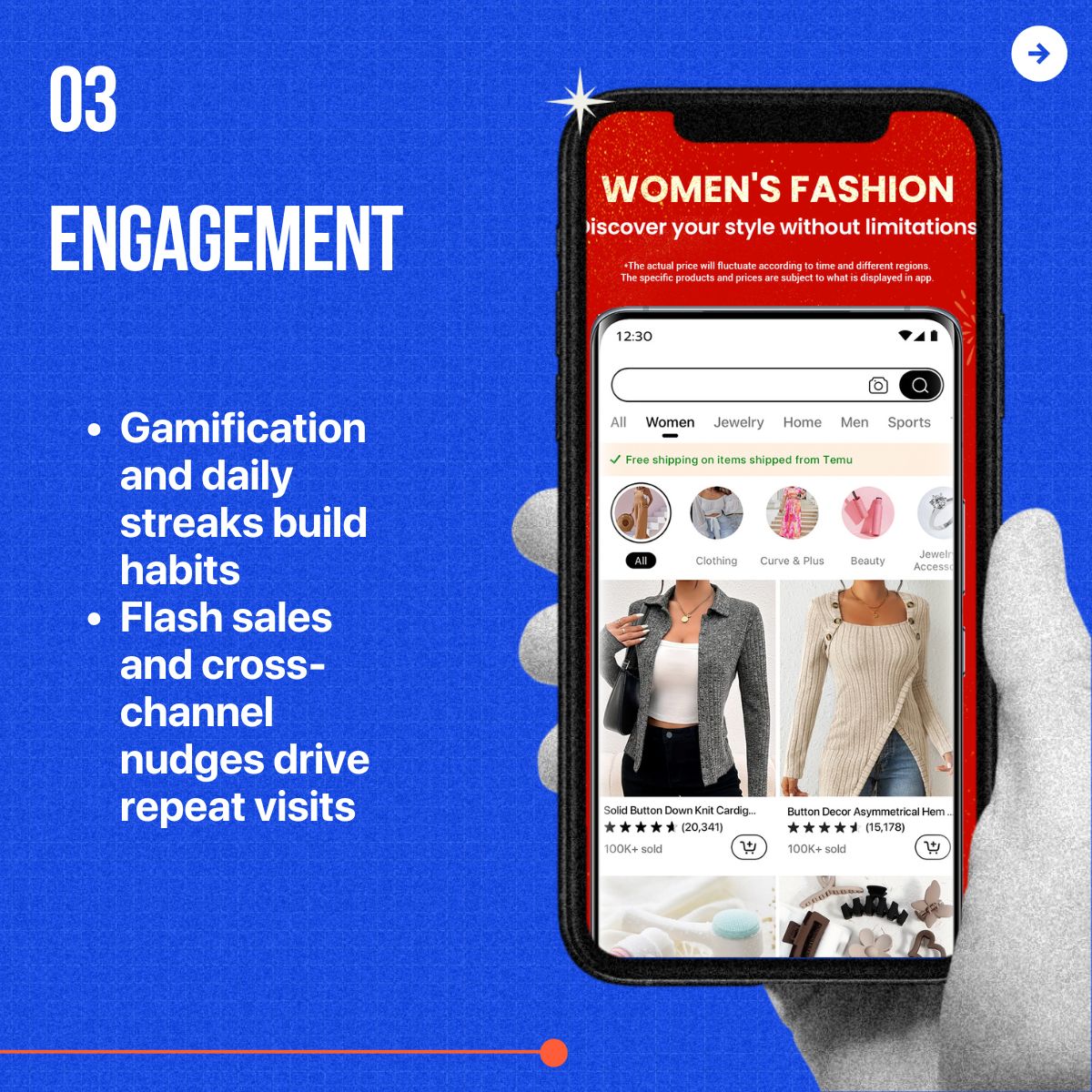 Once onboarded, the goal is habit-building. Temu keeps users coming back with gamification, hyper-personalization, and urgency-driven offers.