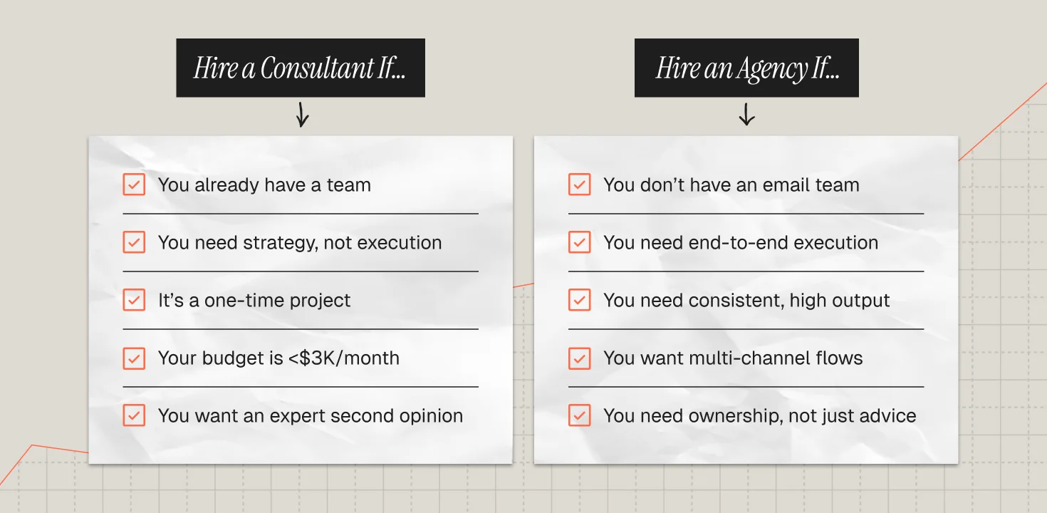A consultant can build your strategy, but they can't produce 8–12 campaigns per month while simultaneously optimizing 15+ flows and managing your SMS program. Agencies have the bandwidth because they staff multiple specialists on your account. Fast-growing DTC brands typically outgrow consultant relationships within 6–12 months.