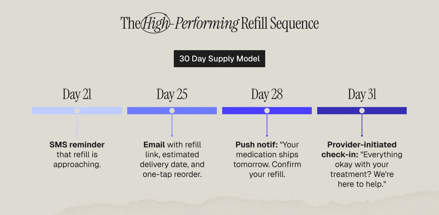 Day 21 (of a 30-day supply): SMS reminder that refill is approaching. Day 25: Email with refill link, estimated delivery date, and one-tap reorder. Day 28: Push notification — "Your medication ships tomorrow. Confirm your refill." Day 31 (if no refill): Provider-initiated check-in — "Everything okay with your treatment? We're here to help."