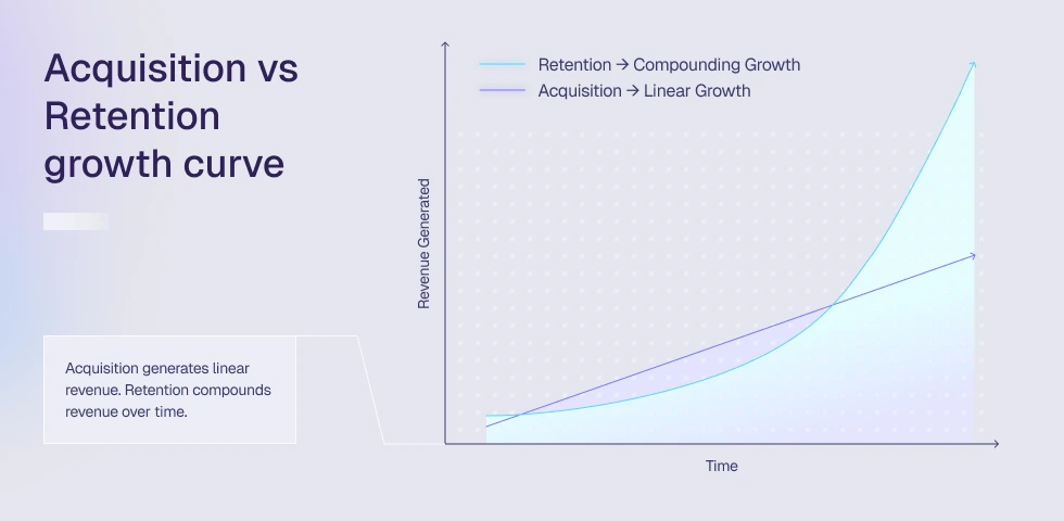 At a systems level, the financial physics of customer acquisition vs retention marketing operate on entirely different curves. Acquisition marketing delivers a linear, non-compounding revenue. Every marginal dollar spent yields a progressively lower return due to audience exhaustion and auction inflation. Retention marketing, driven through owned channels like email, SMS, and push notifications, delivers exponential compounding revenue.